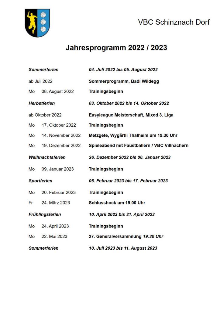 Während den Schulferien findet das Training statt, sofern genügend Spieler teilnehmen. In den Sommerferien treffen wir uns nach spontaner Absprache in der Badi Wildegg zum Beachvolleyball spielen.